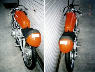 Mr. Oouchi made the rear mudguard helped by Mr. Morita. He is a great collector of the classic racers. He also own Tohatsu 106Y. They made the copy of the mudguard.